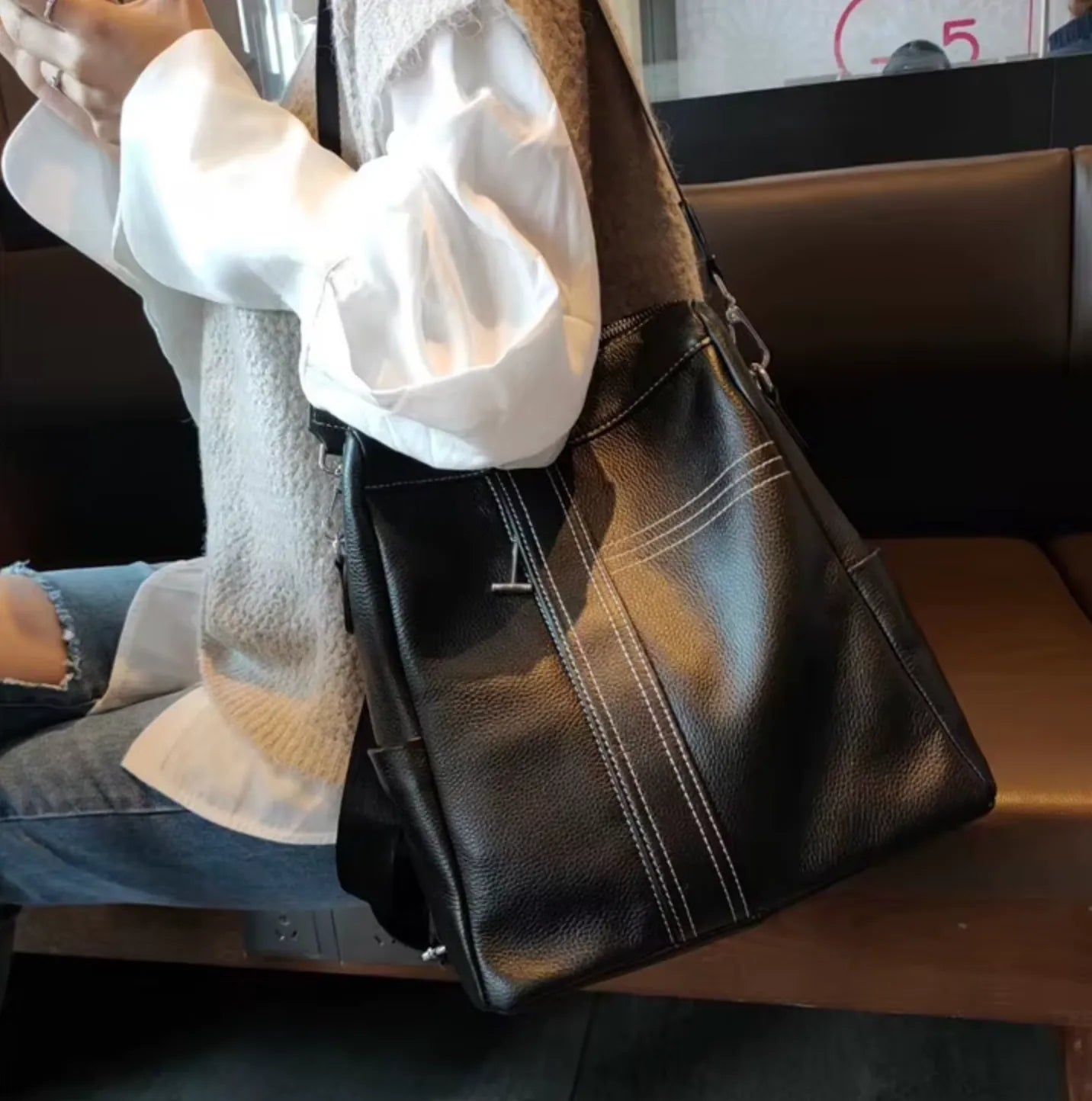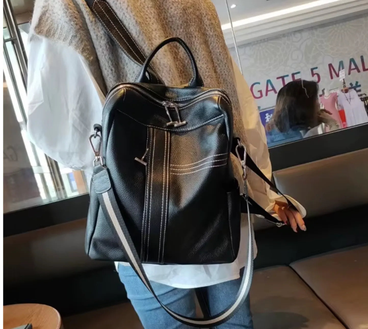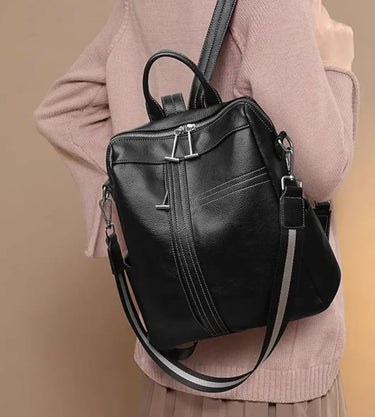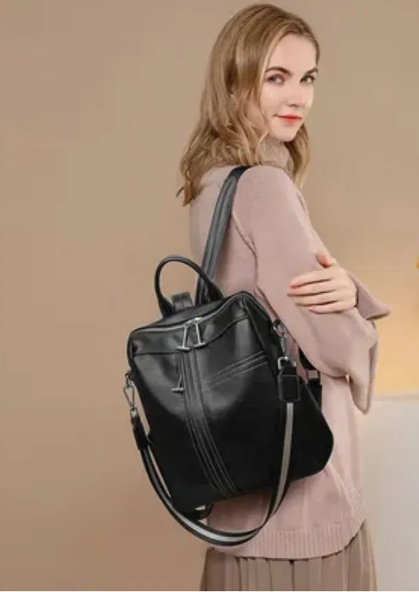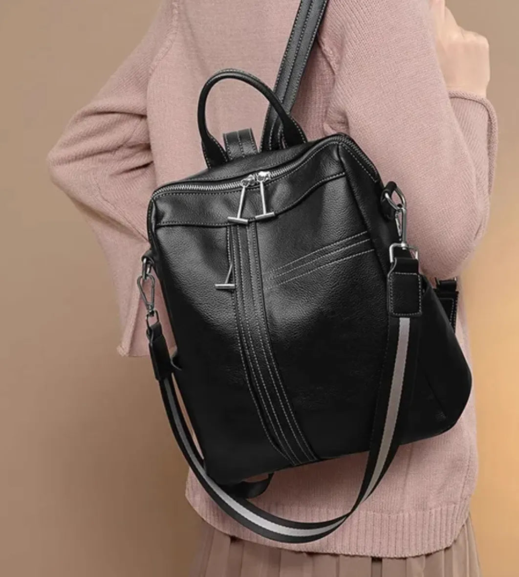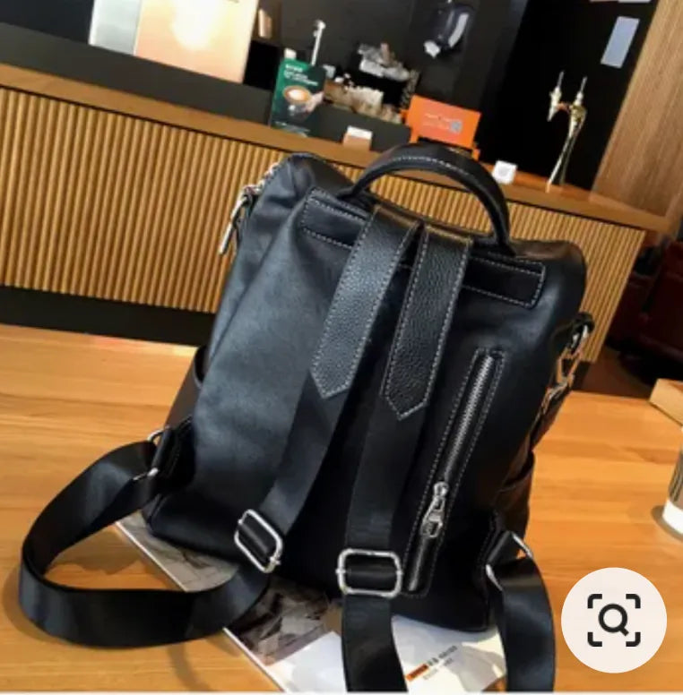 Mochila de cuero premium de espalda y con correa en colores blanco y negro para hombro. Cuenta con bolsillos laterales, dos compartimentos, bolsillo trasero y bolsillos internos.