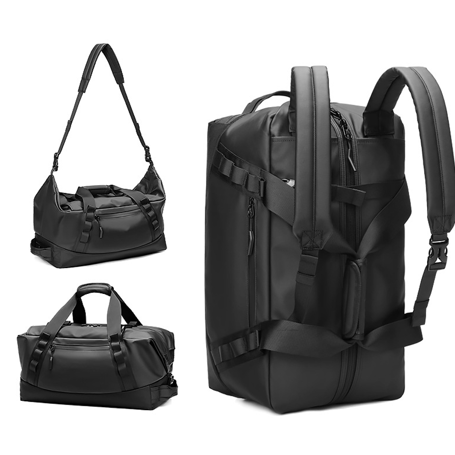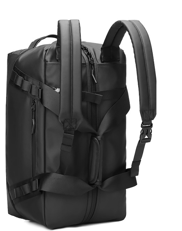 Bolso de tela Oxford con triple correa: para espalda, para hombro y de mano. Cuenta compartimentos laterales y traseros y bolsillos internos. Las correas son ajustables.